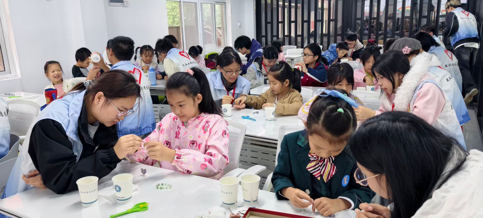 志愿者们和小朋友们一起制作珠串