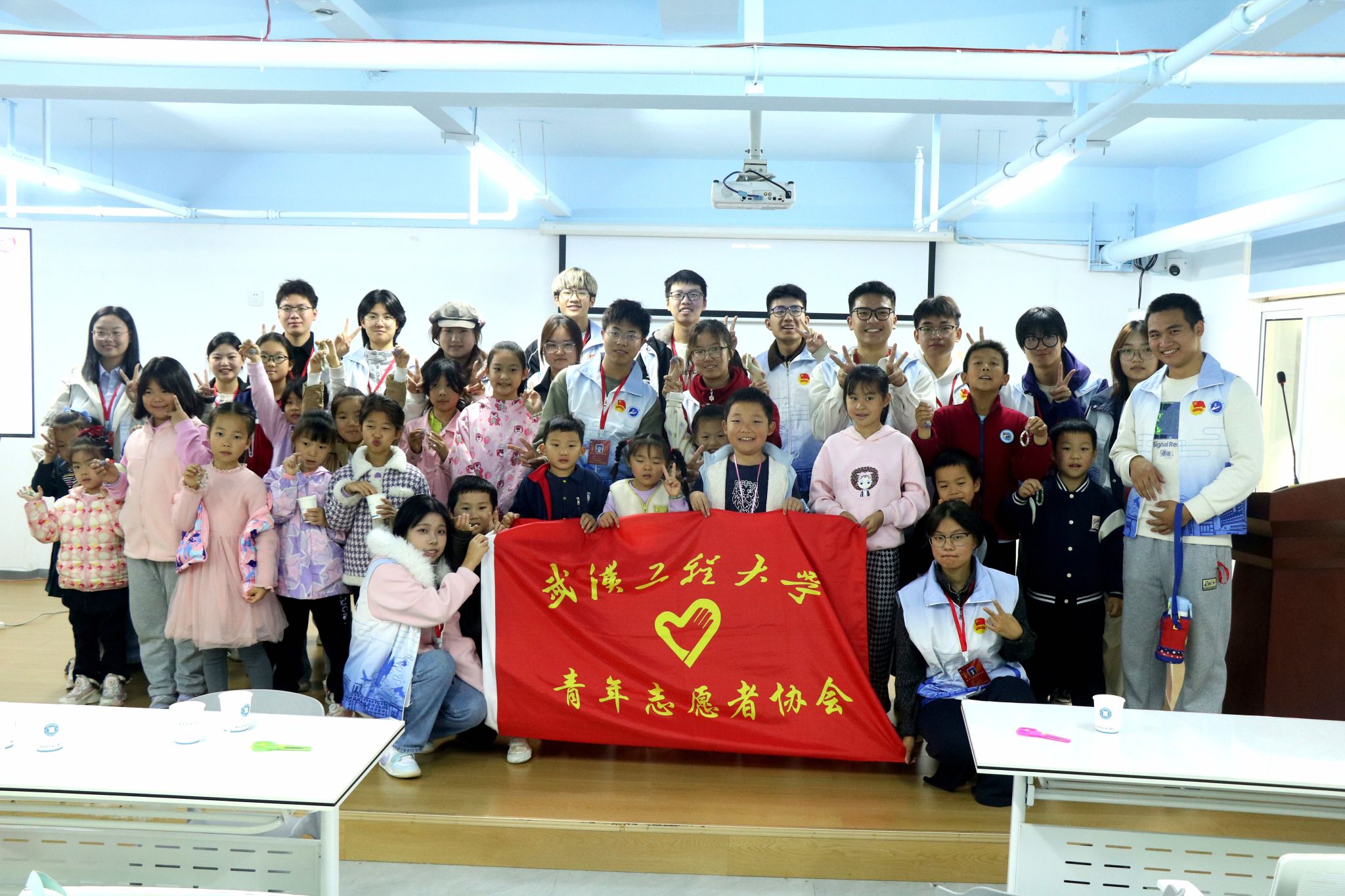 志愿者和小朋友们展示手工成果