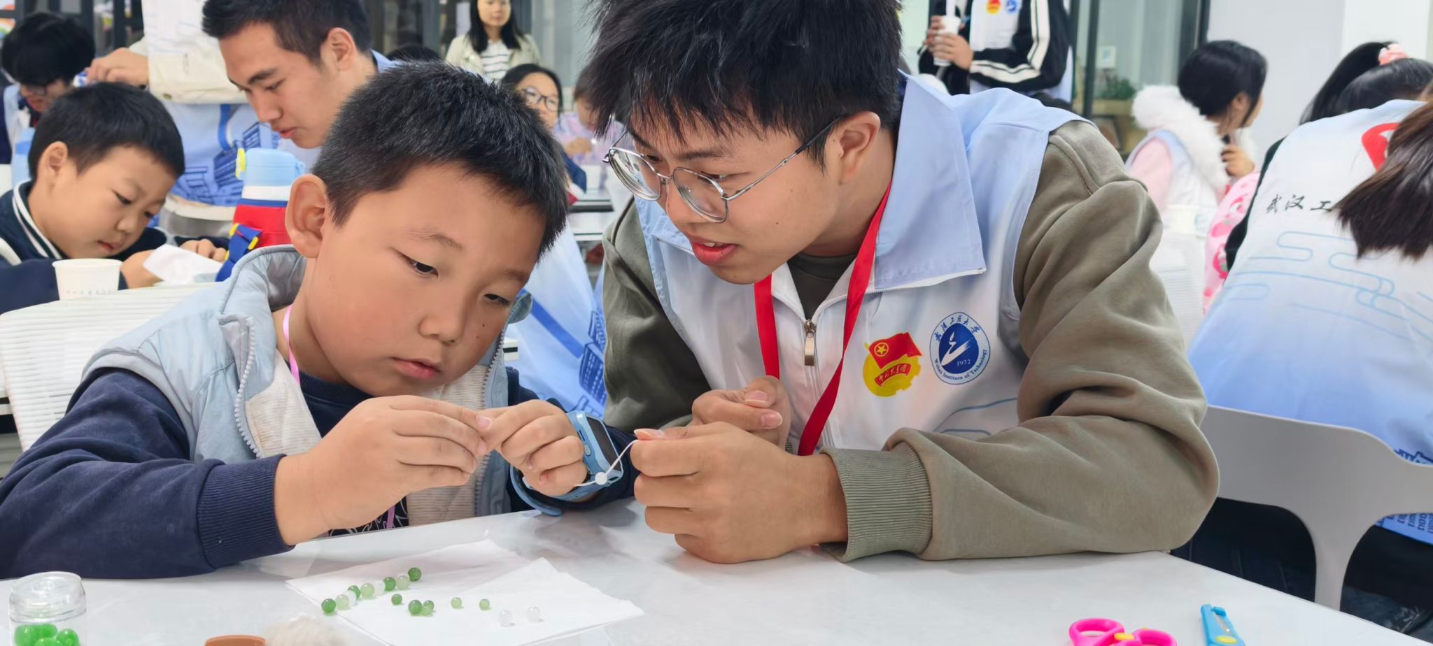 手工制作环节,志愿者们耐心演示串珠技巧,指导孩子们完成手链与吊坠的制作。孩子们在志愿者的陪伴下,设计专属手串样式,认真穿珠打结,一件件精美的手工作品逐渐成型。