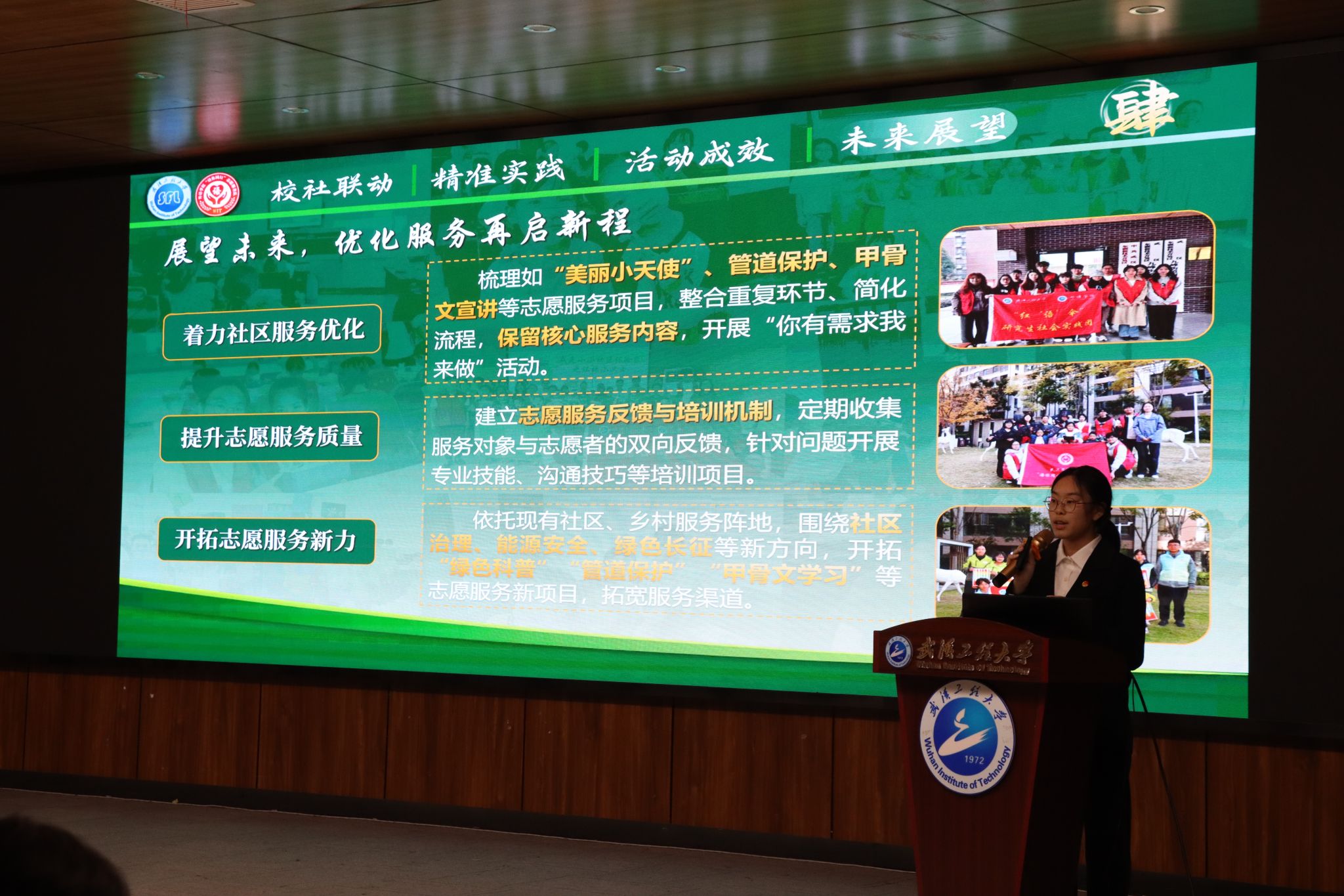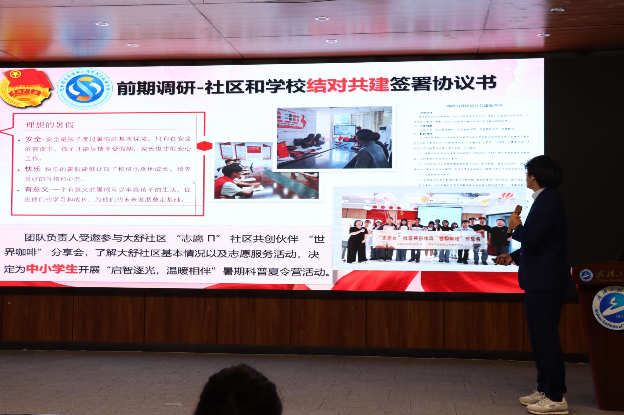 校团委副书记陈恩雨出席并致辞,她首先感谢团省委和学校相关职能部门对共青团工作的支持,她充分肯定过去一年来各项目团队参与社区治理、开展课后服务、开展文体活动、促进基层团建、打造美好环境等方面成绩,指出本次活动既是评审会,也是分享会、更是展示会;她希望各学院团委着力打造常态化实践育人工作格局,将专业优势与社区群众需求有效衔接,探索学生成长成才新路径,通过合作共建、挂牌实践基地等方式,促进大学生社区实践实现长效化、专业化和品牌化。希望15支项目团队“比学赶帮超”,提升组织效能。希望我校被认定的“语你同行”、“守望童心”、“星火”三支湖北省“本禹”志愿服务队,接力奋斗,用青春书写着关于坚守、奉献与成长的答卷。