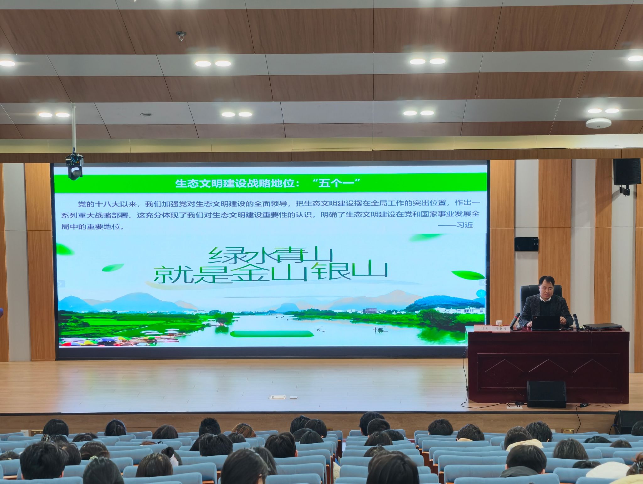 付书科教授作题为《习近平生态文明思想与青春担当》的专题讲座。他系统梳理了习近平生态文明思想的形成脉络,深入解读“绿水青山就是金山银山”“人与自然和谐共生”等核心理念,结合国家生态战略与生动案例,阐释生态文明建设的实践路径与重大意义。付书科强调,新时代青年不仅是绿色发展的见证者,更应成为生态文明建设的积极参与者与推动者,他号召学员从身边小事做起,践行绿色低碳生活,在建设美丽中国的进程中勇担青春使命。