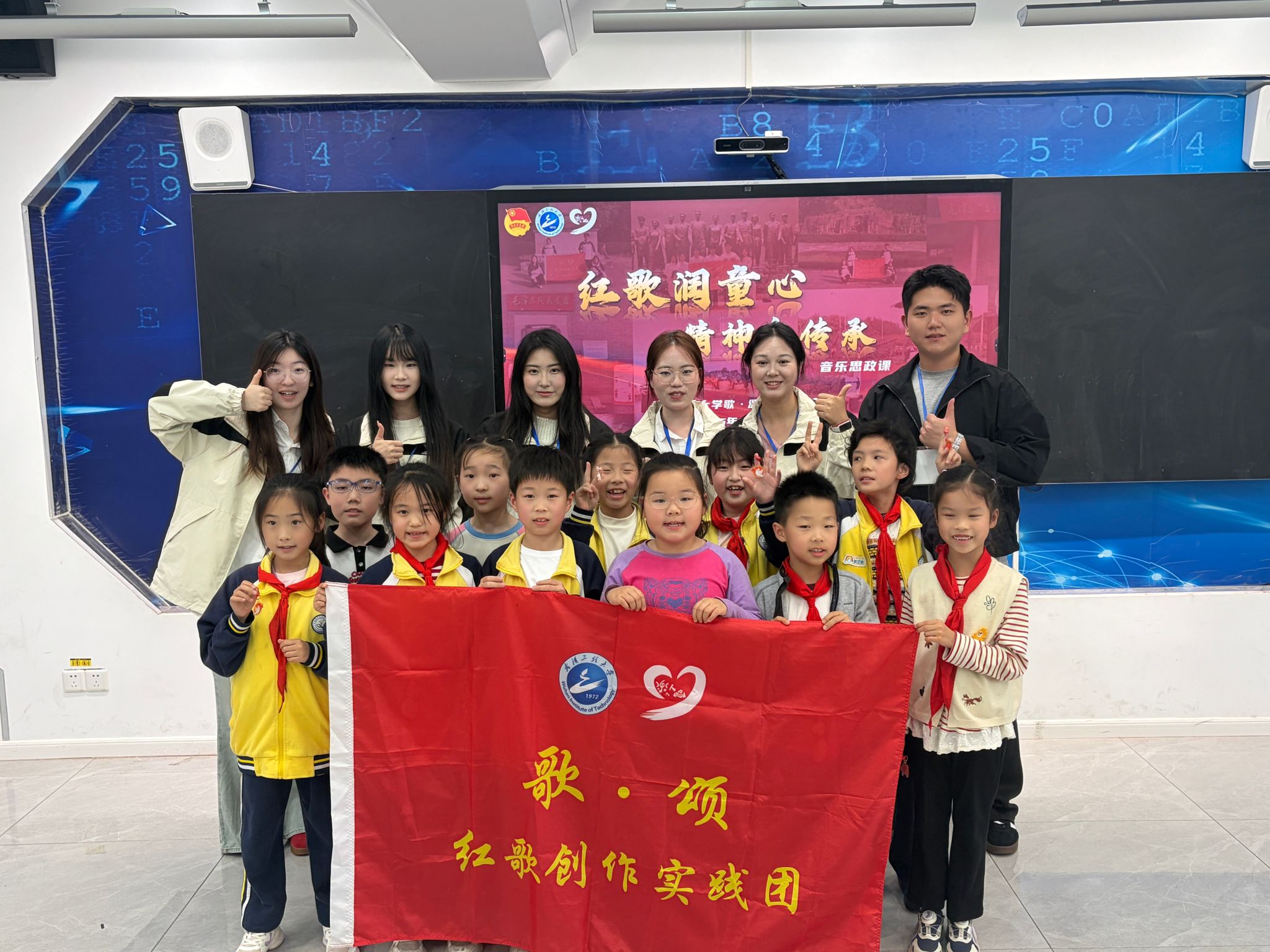 (通讯员 盛文冰 吕新宇)为深入贯彻落实习近平总书记关于推进大中小学思政课一体化建设的重要指示精神,推动红色文化在青少年心中生根发芽,2026年4月13日下午,武汉工程大学歌·颂红歌创作实践团走进武汉市光谷第二小学,为在场学生带来了一场别开生面的红色音乐思政课。活动以“红歌润童心,精神永传承”为主题,通过趣味互动、红歌教唱、原创手势舞教学和成果汇演等形式,将红色经典与思政教育有机融合,以青春之力架起大中小学思政课一体化的桥梁,让红色旋律在孩子们心中落地生根。
